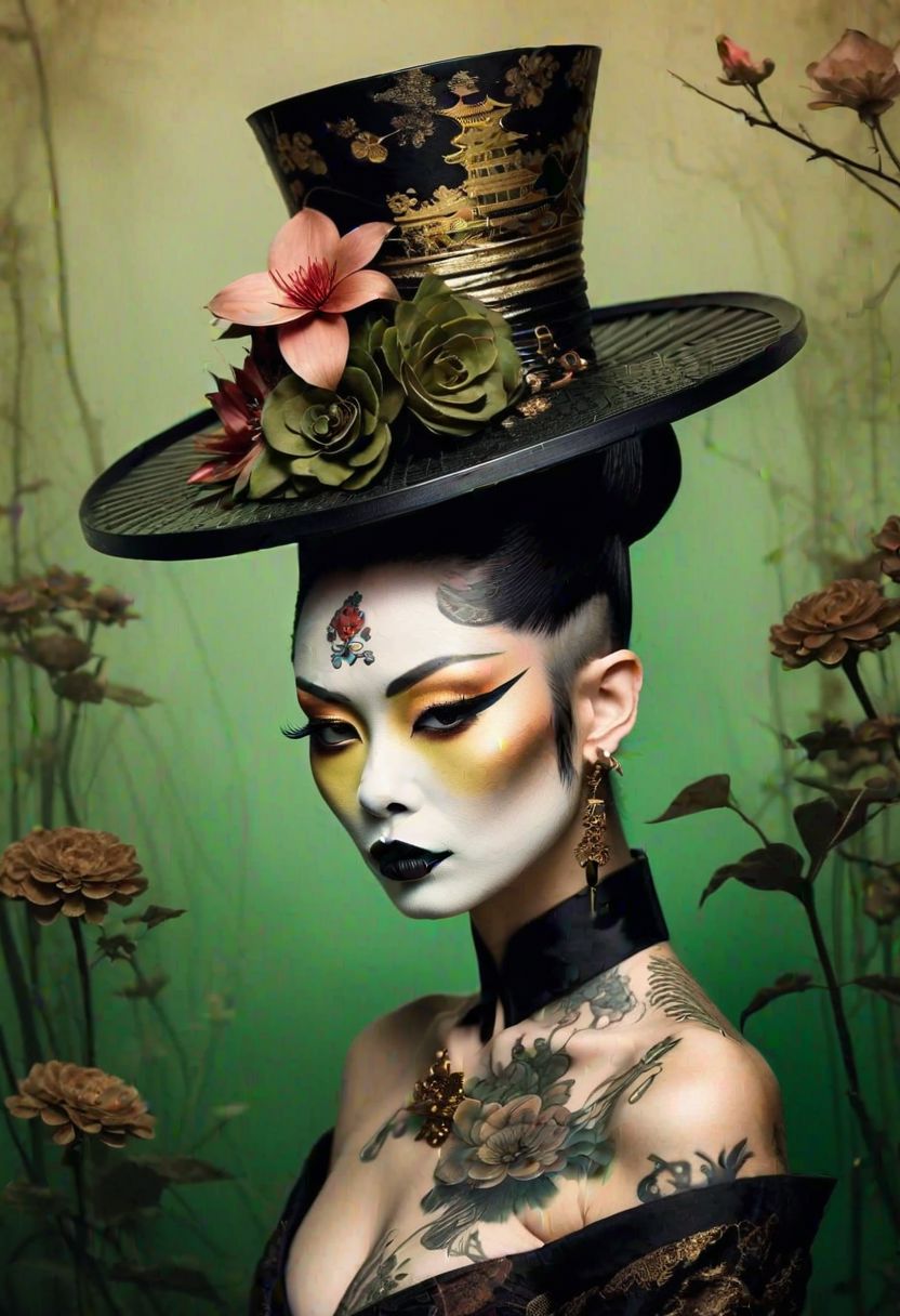 32k hires best quality professional photograph, Dark sci-fi rotten flowery swamp, green mist, tower weird hat, woman tattooed geisha, sphynx cat pet, blood, wilted flowers, opl, brown, black and sepia and gold filigree, minimalism