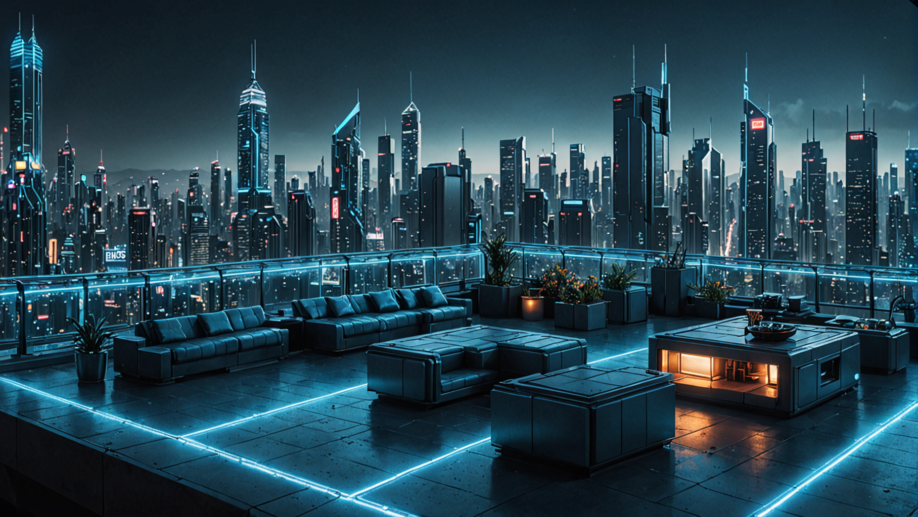 futuristic roof terrace in the foreground, cyberpunk skyline in the background, blue theme, night, creative, photorealism, hyperrealism, highly detailed, high budget, bokeh, cinemascope, moody, epic, gorgeous, film grain, grainy, science fiction <lora:epiNoiseoffset_v2-pynoise:1> <lora:add-detail-xl:0.5>