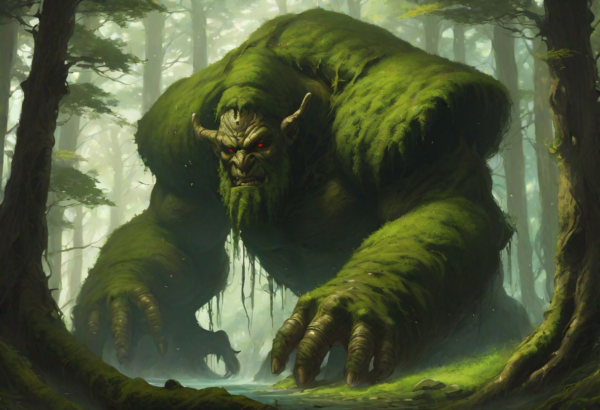 A giant mossy stone stomping throgh a forest golem in a wet and lush forest , Medieveal , fantasy , anime