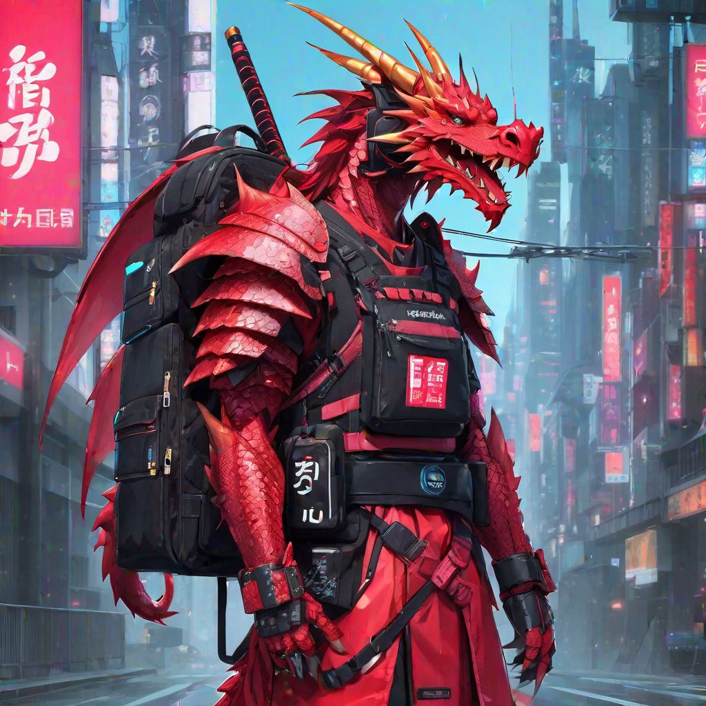 anthropomorphic, red dragon, in samurai armour, cyberpunk, high quality, masterpiece, 8k, full, anime, wearing radio backpack,