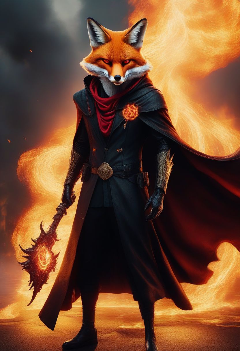 A mesmerizing 4D Unreal Engine 9 portrait of a fierce fox male character in a fursuit, exuding a supervillain vibe. He dons a cape, a black hood, and has striking red eyes. The background is a flaming inferno, with the character's hands ablaze and golden wings engulfed in flames. The chest emblem features an infinity symbol, and the overall atmosphere is of intense seriousness and epic power.