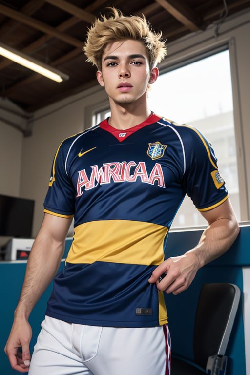(best quality)),((masterpiece)),(detailed),one gay boy, brazilian, realistic twink, thin slim, wearing football jersey, bulging upwards boner, pubic hair American,baseball_uniform,blonde hair,messy hair, stadium, bulge in focus