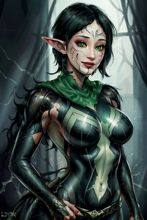 breasts, makeup, lipstick, lips, curvy, narrow waist, (masterpiece:1.0), (best_quality:1.0), ultra high res, 4K, ultra-detailed, 8K, loving smile, MerrillDA, 1girl, solo, pointy ears, black hair, green eyes, short hair, elf, facial mark, smile, looking at viewer, tattoo, piercing, face tattoo, <lora:epi_noiseoffset2:1>, <lora:MerrillDA:0.7>, she venom, symbiote, upper body, close up