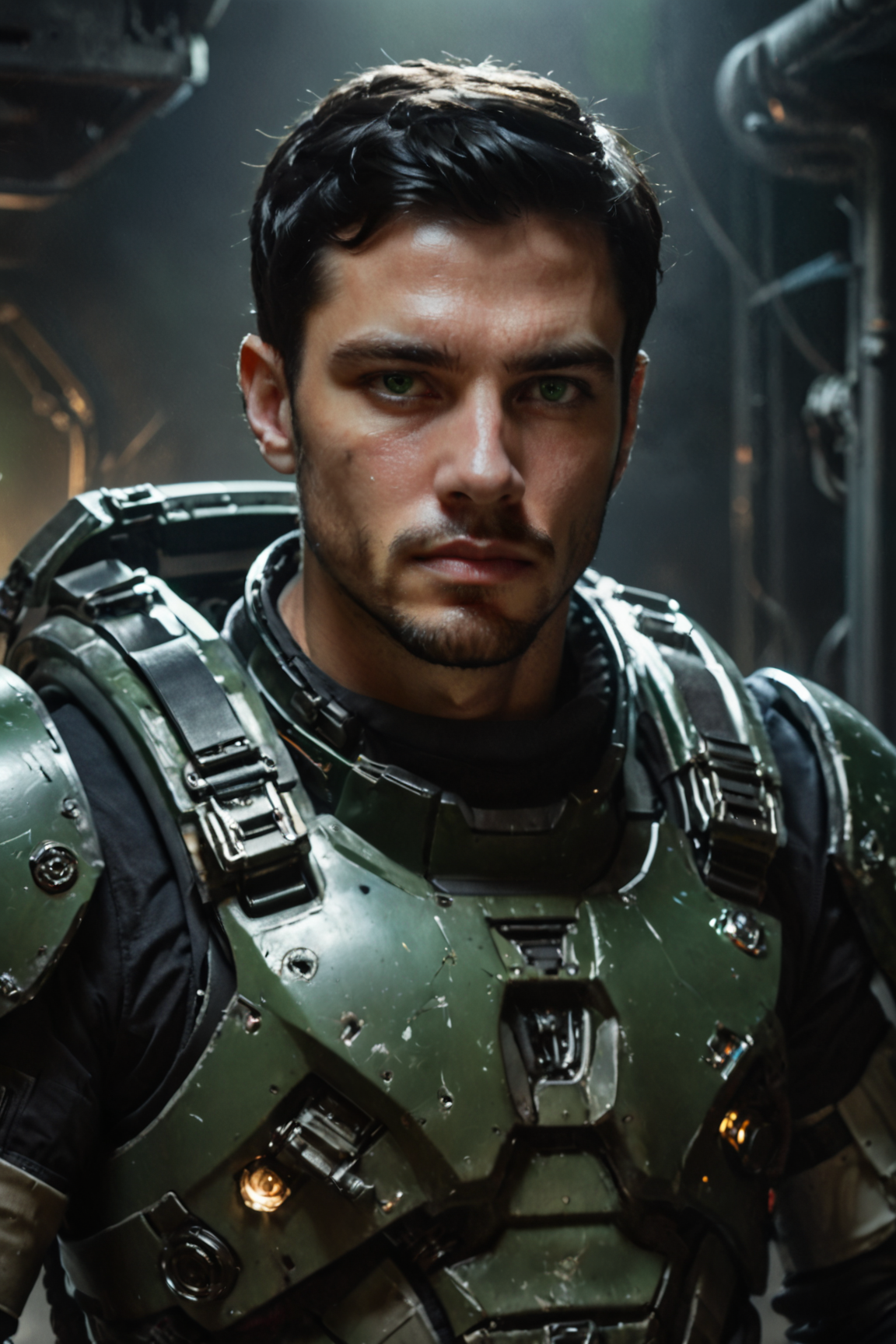 portrait of a soldier, male, 30 year old, very short black hair, green eyes, in dark armored space suit, holding helmet in arm, grim, masterpiece, shallow depth of field, cinematic lighting, rim light, dark blue background, concept art, ((oil painting)), scifi, science fiction, <lora:add-detail-xl:1> <lora:bichu-v0612:1> <lora:Concept Art Style SDXL_LoRA_Pony Diffusion V6 XL:1>