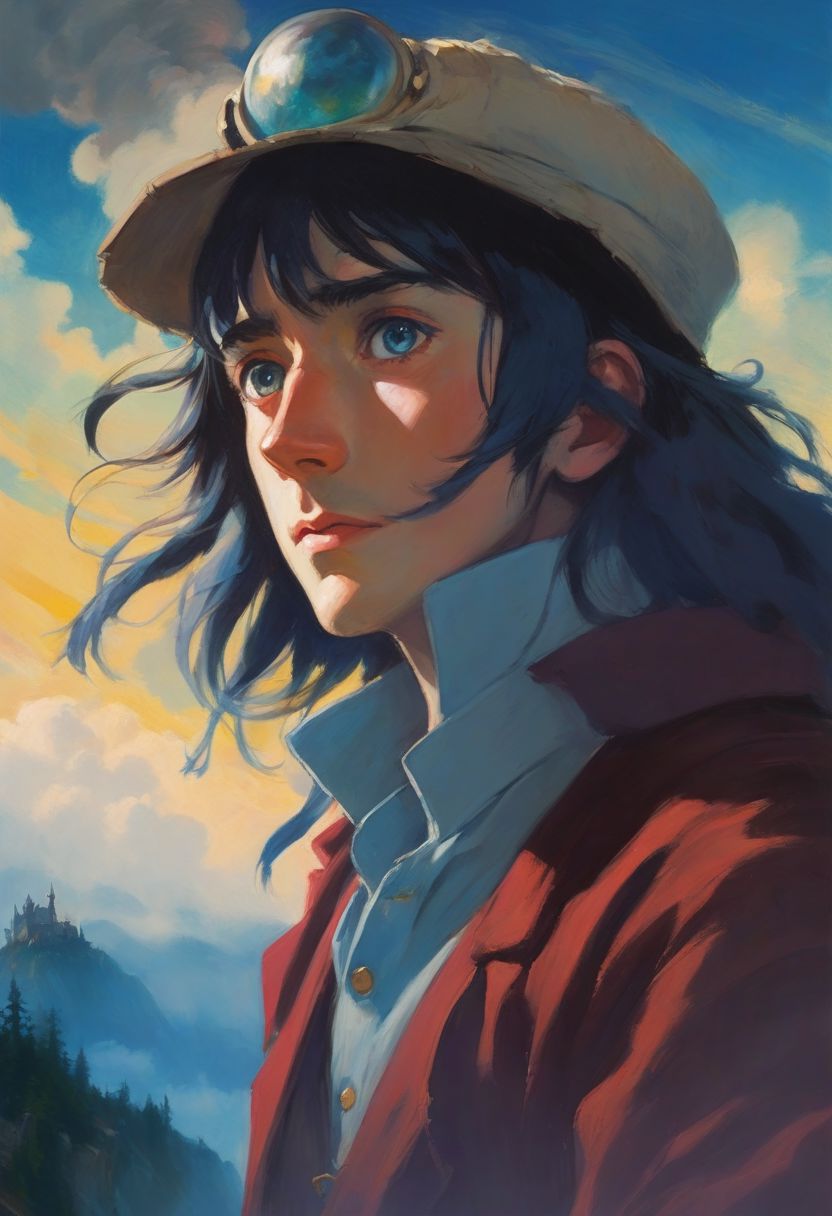 On the Edge of the Unknown: Howl's Moving Castle (2003), portrait, highly detailed, digital painting, artstation, concept art, sharp focus, illustration, cinematic lighting, style of Clarence Gagnon, Francis Picabia, Emmy Bridgwater, Sam Kieth