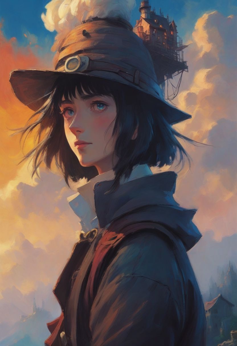 On the Edge of the Unknown: Howl's Moving Castle (2003), portrait, highly detailed, digital painting, artstation, concept art, sharp focus, illustration, cinematic lighting, style of Clarence Gagnon, Francis Picabia, Emmy Bridgwater, Sam Kieth