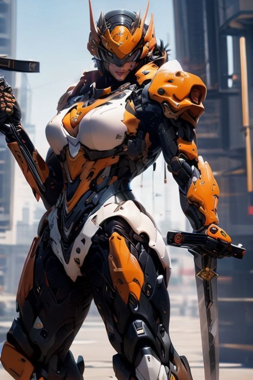 <lora:Mecha warrior Mecha_20230621092507:0.4> Best quality, masterpiece, Graceful curve, Structure simplification, Detail reduction, the sword, (young, black , micro bangs, hair band, freckles, BIG beautiful anime eyes, SPARKLING blue eyes, graphic eyeliner )seductive, sexy smile, dynamic pose, Mecha warrior, hourglass figure, cleavage,