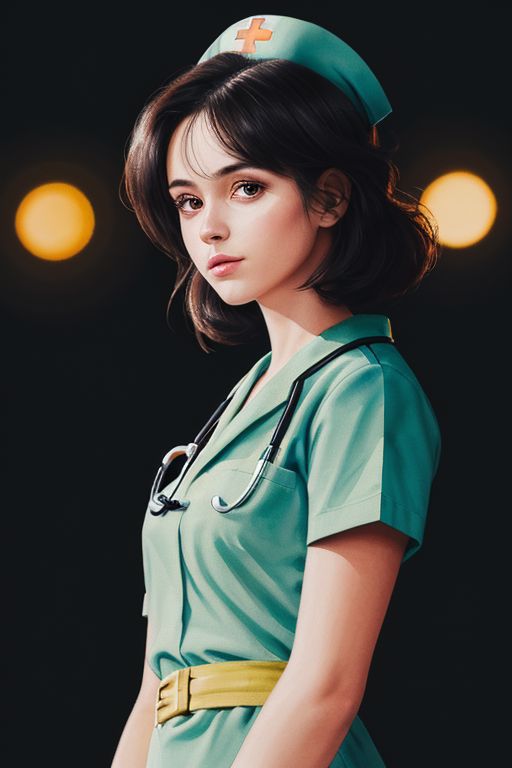 (8k, best quality, masterpiece:1.2),(best quality:1.0), (ultra highres:1.0), watercolor, a beautiful woman, shoulder, dark hair , half body portrait, extremely luminous bright design, pastel colors, hostipal stage, autumn lights, nurse uniform
