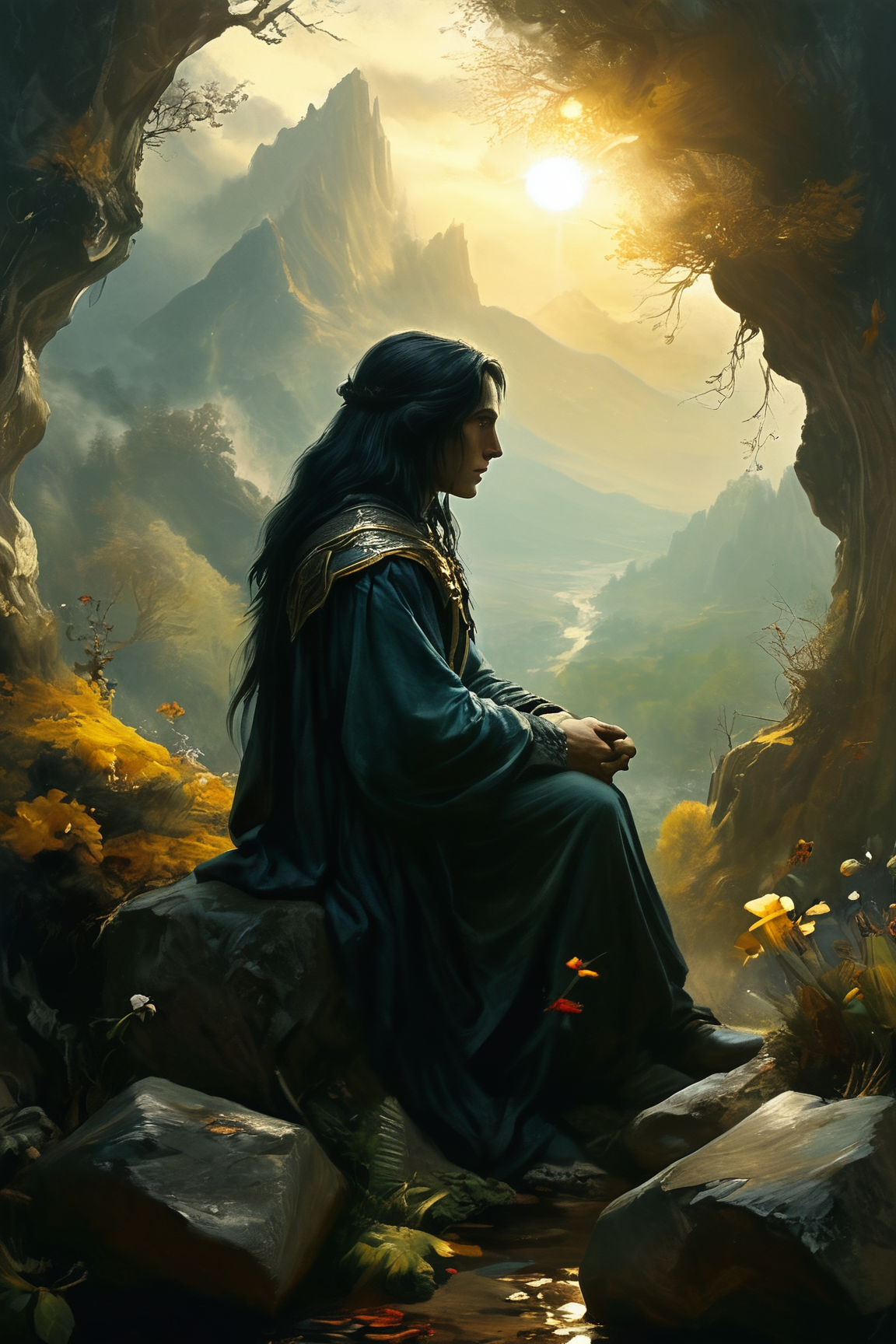 (art by vermeer:1.3), (fantasy illustration of the world of tolkien:1.3), male elf, long black hair, (for his valour was as a fire and yet as steadfast as the hills of stone; wise he was and skilled in voice and hand; truth and justice he loved and bore good will to all, both Elves and Men, hating Morgoth only; he sought not his own, neither power nor glory, and death was his reward.:0.5) <lora:add-detail-xl:0.7> <lora:aesthetic:0.7> <lora:Into_Darkness:0.4> <lora:MJ52:0.4> <lora:ral-dissolve-sdxl:0.4> <lora:xl_more_art-full_v1:0.5>