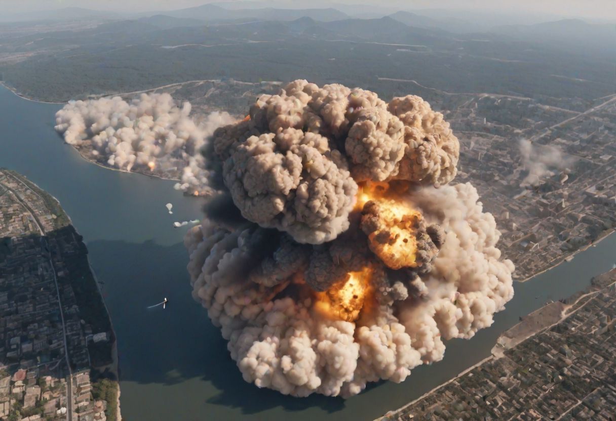Air plane dropping Atomic bomb, blast in the center of the drone view from above, extremely detailed, ultra-realistic, full sige view, realistic, 8K, UHD