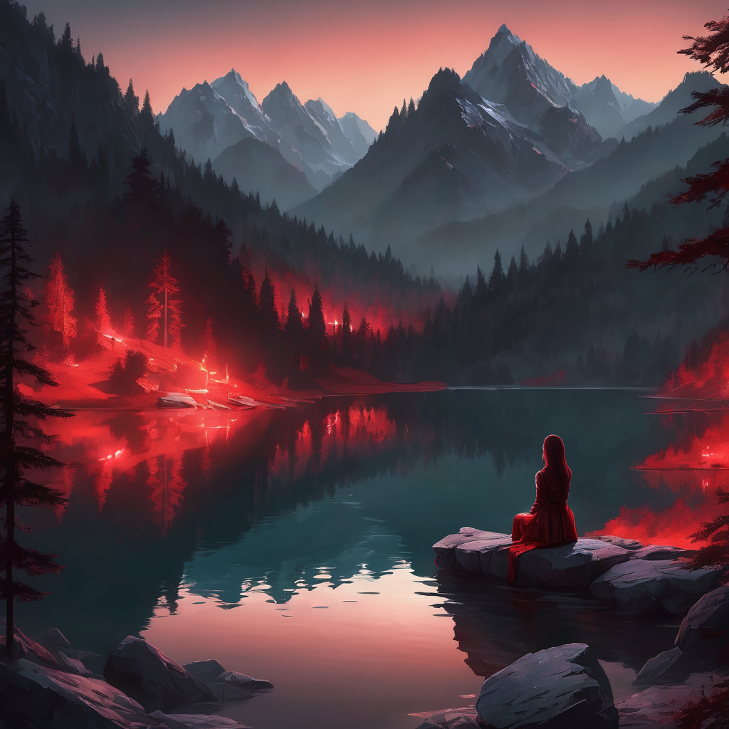 depict a cascaded landscape with low twilight and a girl ,red lights reflected on a beautiful lake surrounded by cascaded mountains. ultra-realistic, mysterious, mystical, high dynamic range,