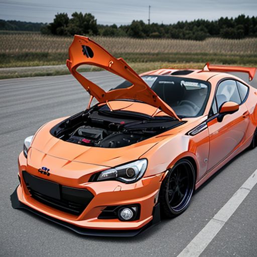 brz stanced slammed car, black rims, hood off, 2 turbos,