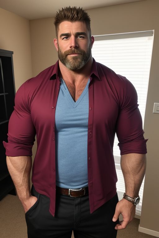 A sexy, hot, beefy, hairy, stocky, huge muscle middle aged man, He appears to be posing for a picture.