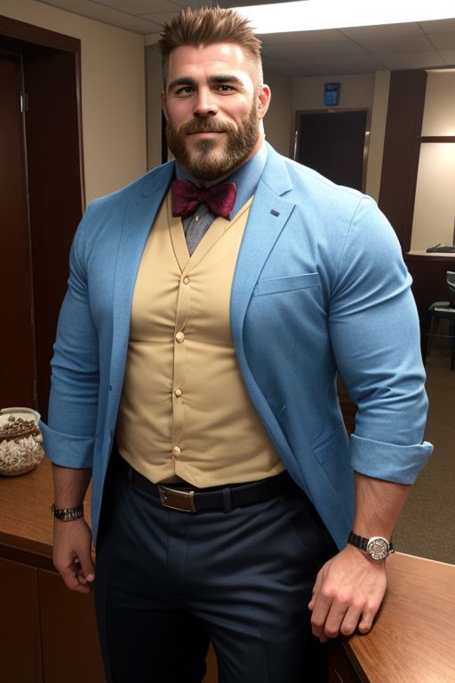 A sexy, hot, beefy, hairy, stocky, huge muscle middle aged man, He appears to be posing for a picture.