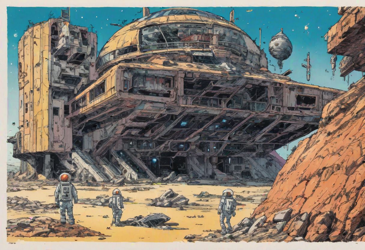 detailed pen and ink illustration of an abandoned building of a spacestation, by Herge, in the style of tin-tin comics, vibrant colors, detailed, two astronauts, shrouded light, derelict spaceship, harsh Planet surface