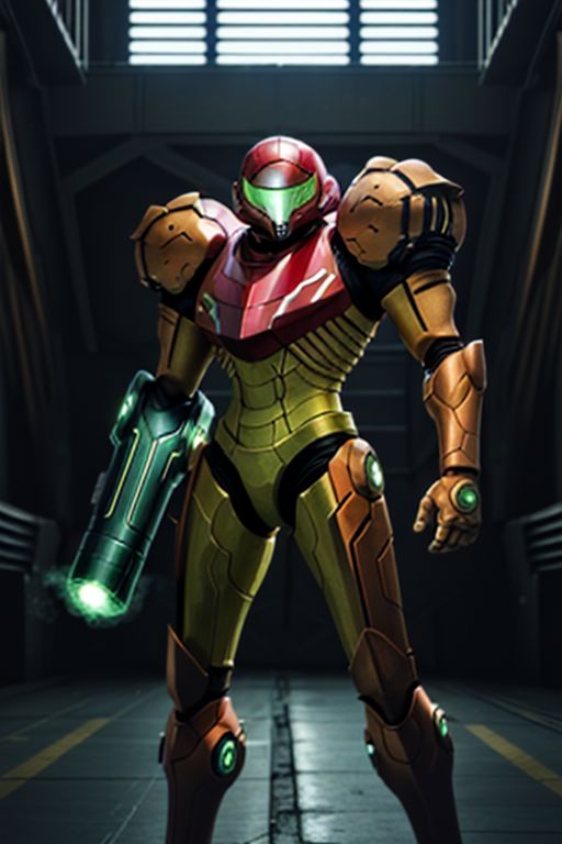 ((masterpiece,best quality)), <lora:Samus_Varia_Suit:0.8>, samus aran, (orange armor:1.2), varia suit, arm cannon, highres, official art, solo, cowboy shot, shiny metal, <lora:more_details:0.3>, glow, cinematic composition,