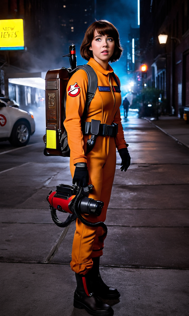 <lora:velmasdxl:0.8>, velmasdxl, girl dressed as a Ghostbuster posing on sidewalk, cinematic lighting, best quality, brown bob cut, focus on eyes, powerpack, brown jumpsuit, backpack, new york, dark, dim lighting, coveralls, holding blaster,