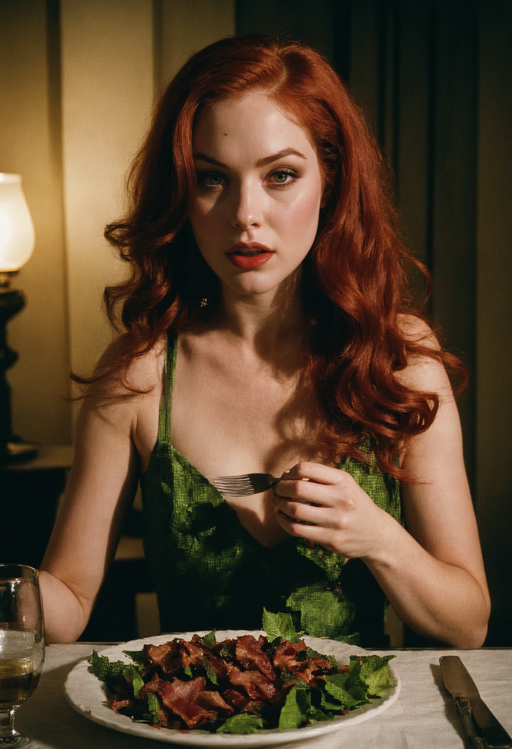 poison ivy, eating dinner, bacon, dramatic lighting, less saturated, film grain