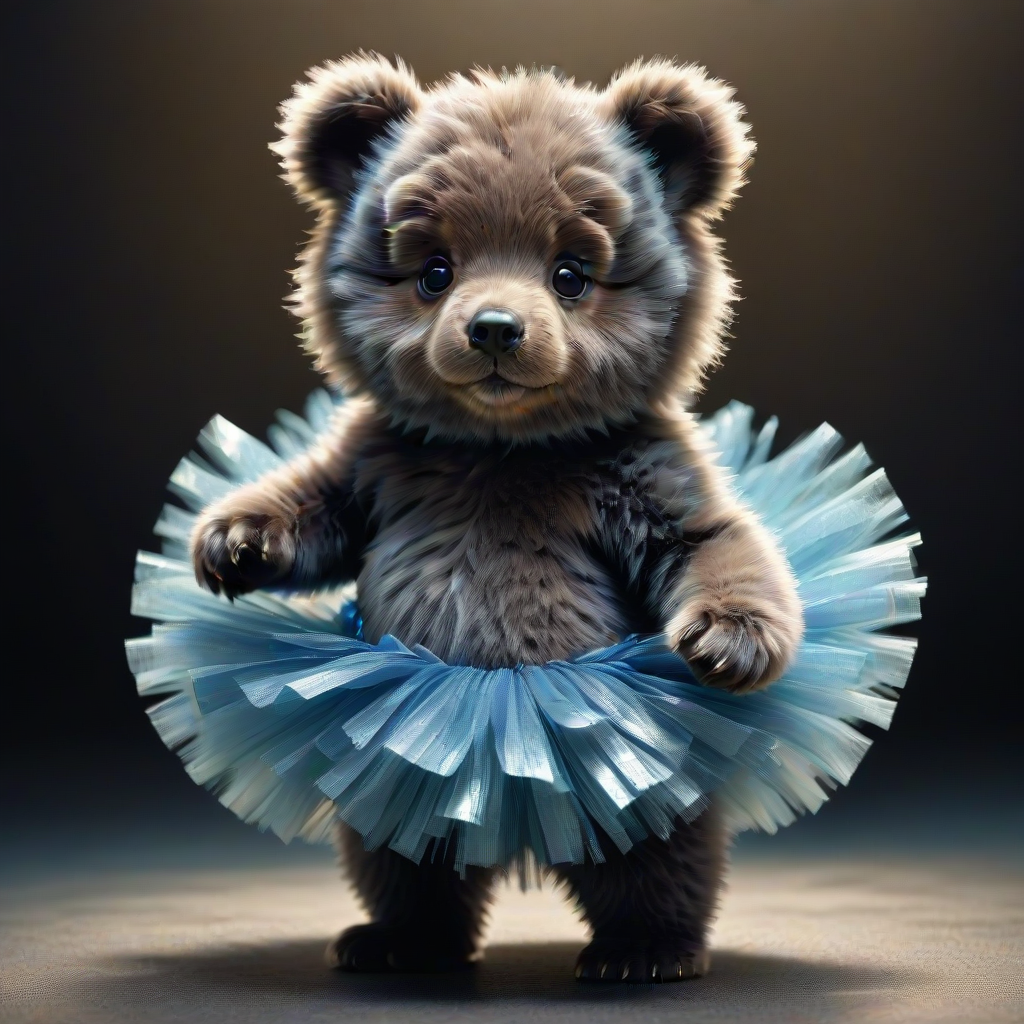print of print, in style of Hiroshi Yoshida. An adorable blue fluffy silly little bear with shaggy hair wearing tutu, 8k resolution, hyperdetailed photograph, shiny, beautiful lighting, iridescent lighting, iridescent colors, perfectly shaded, out of this world beautiful, smooth, clean, rich