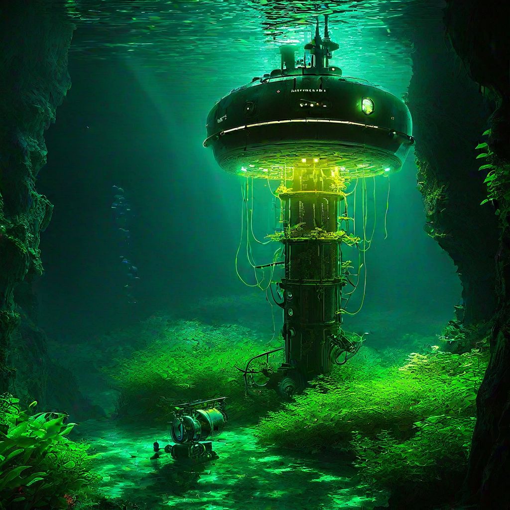 A steampunk submarine in the depths of hydrospace. The weak light of the spotlights barely penetrates the water column. Biologically luminous deep organisms and fish give the landscape a mystical appearance. Underwater plants glow at the bottom.