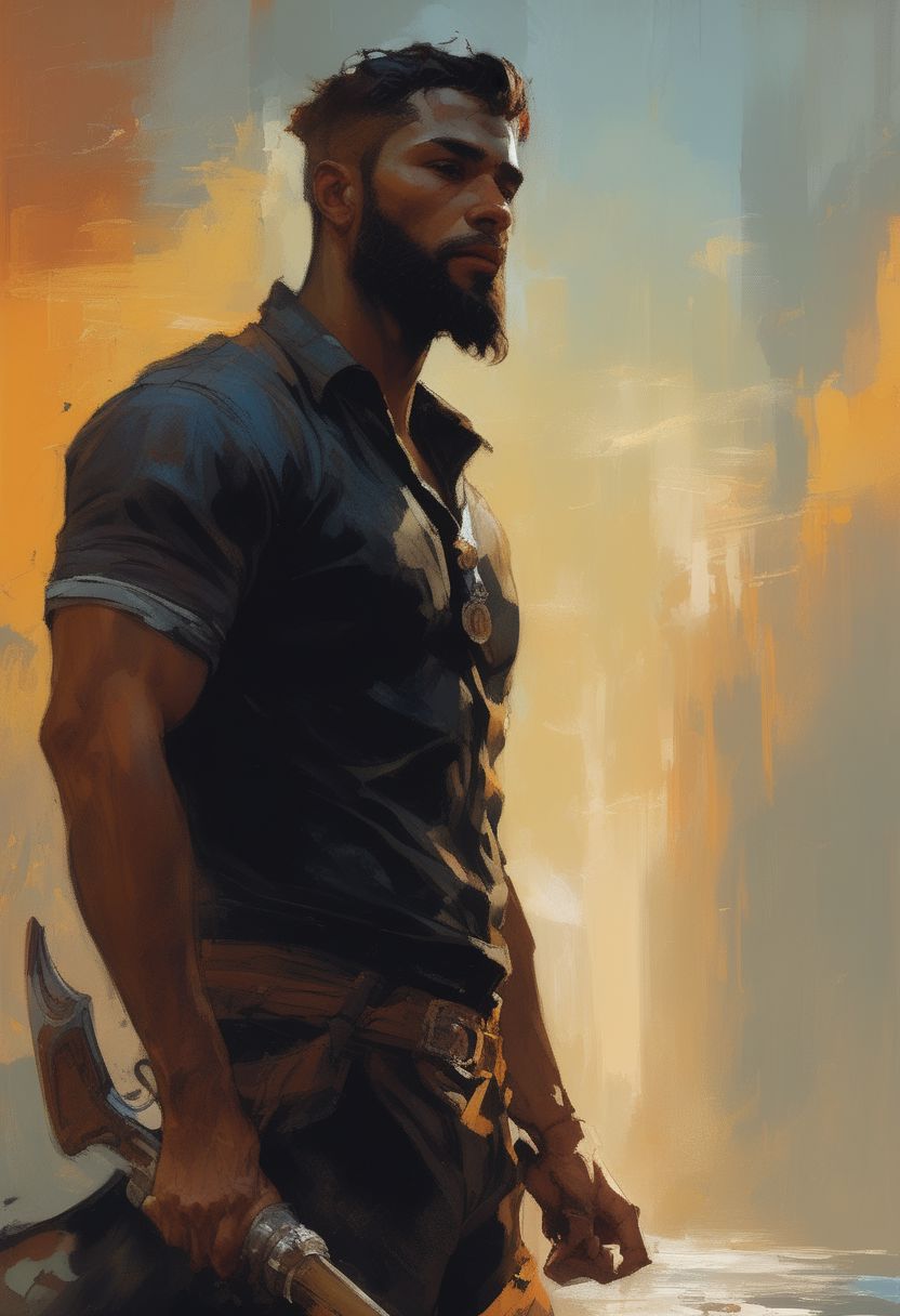 extremely detailed masterpiece (by Daniel F Gerhartz|Ian McQue|Maximilian Pirner]. smooth hero shot. fantasy, sci-fi, futuristic. an (extremely-muscular:1.5], attractive, manly, sexy, rugged, 28-year-old Brazilian man with a dark very short undercut smirks, daring the viewer. He sports an unshaved, perfect, stylish, short, neatly-trimmed beard and (body hair:1.8]. He wears a tight, collared v-neck shirt, as well as a simple necklace. He personifies mischief, danger, intrigue, mystery, and suspicion.