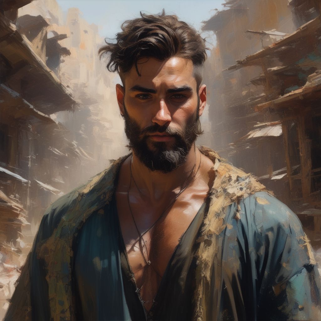 extremely detailed masterpiece (by Daniel F Gerhartz|Ian McQue|Maximilian Pirner]. smooth close-up portrait. fantasy, sci-fi, futuristic, high-tech. an (extremely-muscular:1.9], (extremely-hairy:1.8], attractive, manly, sexy, rugged, 28-year-old Iraqi man with massive hairy pectorals and a dark very_short_undercut (grinning broadly:1.7], daring the viewer. He sports an unshaved, perfect, stylish, short, neatly-trimmed beard, and has mahogany-toned skin. He wears a tight, collared, v-neck shirt, as well as a simple necklace. He personifies mischief, danger, intrigue, mystery, and suspicion.