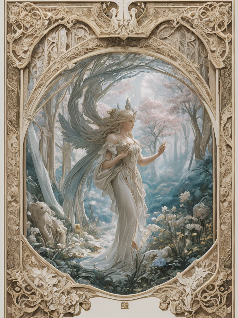 masterpiece, best quality, ultra high res, An enchanted forest gateway, epic action and dynamic pose, in the style of opaque resin panels, precisionist, ivory, magical girl symbolism, close-up, elaborate borders, surrealistic assemblage