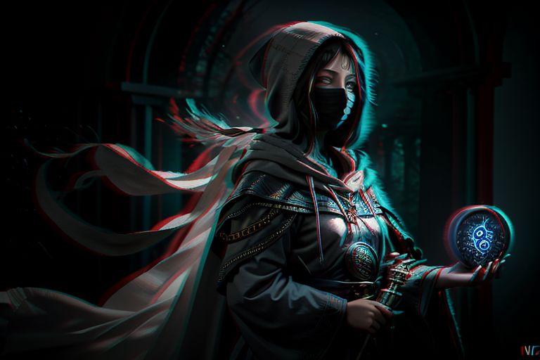 A ghostly female silhouette. Messenger of Nature God. Exiled shaman. integral mask.dark canvas toge. Canvas hood. Runic circle. Elements. Power from inside. Glowing eyes. Bokeh blur. ral-dissolve.BadDream photorealistic,