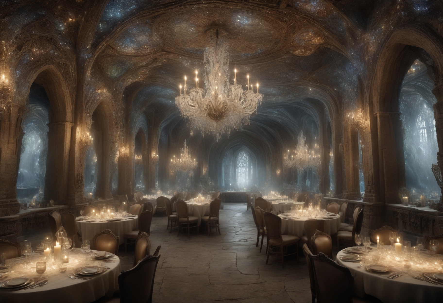 (masterpiece, best quality,detailed light), murmurs of satisfied diners dining hall, elegant chairs, ceramic plates, magic dishwashers, gourmet ghosts, , waste-free processing, scented candles,hyper detailed masterpiece, dynamic realistic digital art, awesome quality,holographic ingress,computer-generated cavity,epochal fortress atmospheric scattering,interface anomalies, plentiful, fantasy, fairytale, magical, colorful, whimsical, mystical intricate detail, cinematic lighting, <lora:released\DonM3t3rn1tyXL-v1.1-000008:0.6> <lora:myLoraXL_test\DonM50und0fMu51cXL-000006:0.6>,