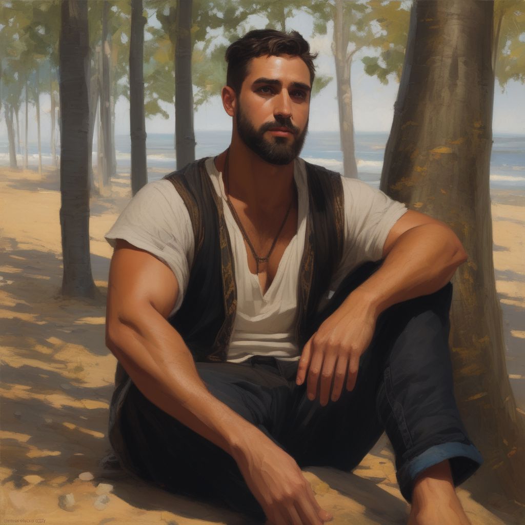 extremely detailed masterpiece (by Daniel F Gerhartz|Sam Guay|Maximilian Pirner]. full body portrait. a 28-year-old Iraqi man rests against a tree. He wears a sleeveless, ornately-embroidered, v-neck shirt; black pants; and a simple, plain necklace. he is manly, (muscular:1.9], (extremely-hairy:1.8], and roguish, with massive biceps; a dark very short undercut; an unshaved, perfect, stylish, short, neatly-trimmed beard; and mahogany-toned skin. He personifies mischief, danger, intrigue, and mystery.
