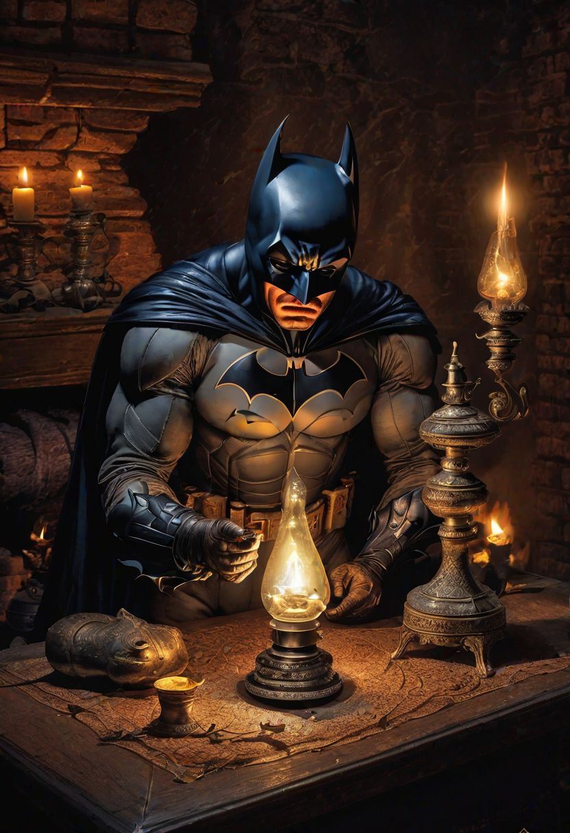 Batman repairing an oil lamp, fireplace, colored, beautiful image, masterpiece, mystic, demonic magic, dark fantasy style