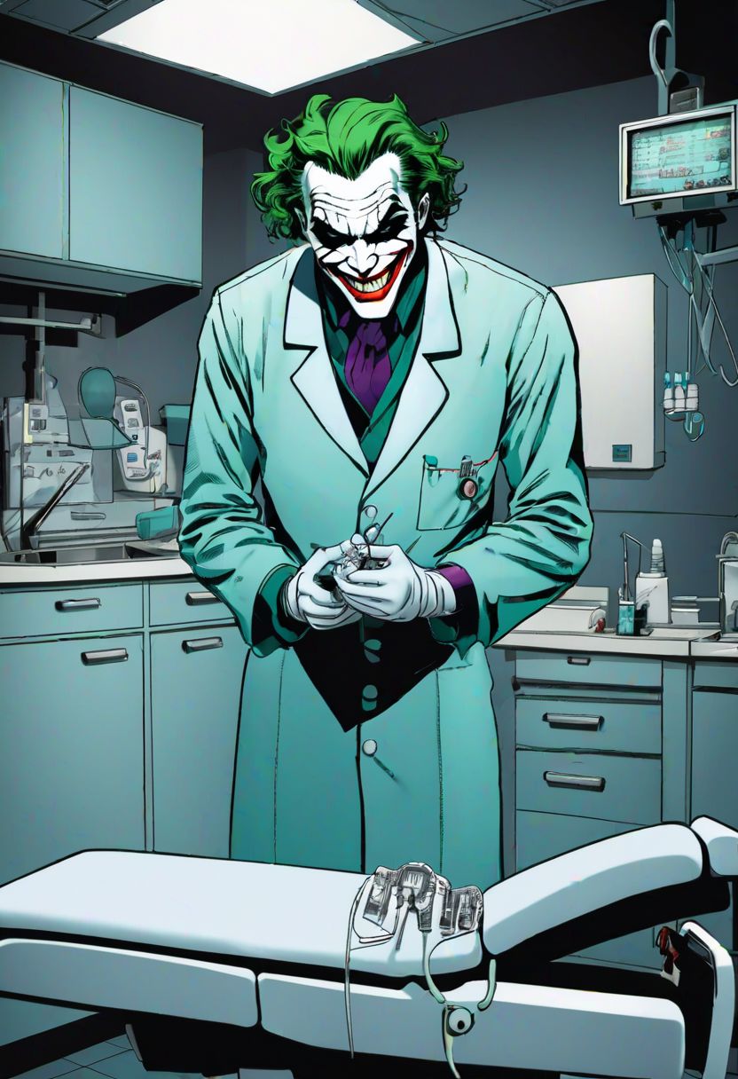 Joker supervillain, comic book style, working as a dentist, dentist uniform, patient waiting for him, dentist cabinet, dark atmosphere, joker smiling, holding dentist equipmemt, during operation, patient on a stool