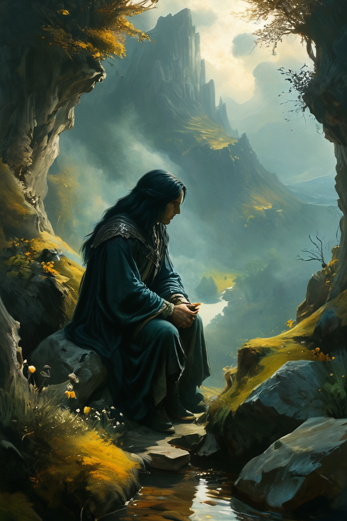 (art by vermeer:1.3), (fantasy illustration of the world of tolkien:1.3), male elf, long black hair, (for his valour was as a fire and yet as steadfast as the hills of stone; wise he was and skilled in voice and hand; truth and justice he loved and bore good will to all, both Elves and Men, hating Morgoth only; he sought not his own, neither power nor glory, and death was his reward.:0.5) <lora:add-detail-xl:0.7> <lora:aesthetic:0.7> <lora:Into_Darkness:0.4> <lora:MJ52:0.4> <lora:ral-dissolve-sdxl:0.4> <lora:xl_more_art-full_v1:0.5>