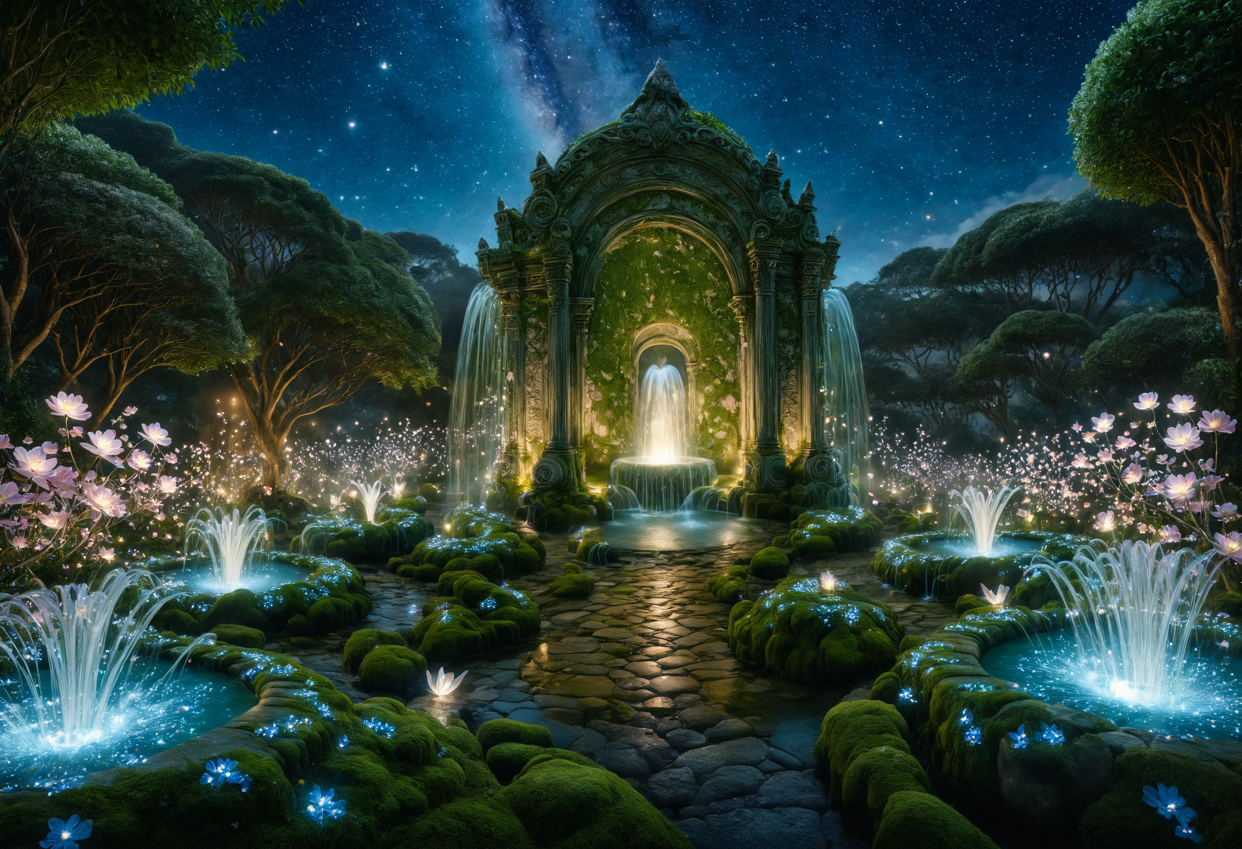Visualize a vast, sprawling garden illuminated by the light of a thousand luminescent flowers under the soft light of a starry sky. Paths lined with glowing pebbles wind through the gardens, leading to a majestic fountain at the center that spills glowing water. Statues of mythical creatures, covered in tiny, phosphorescent moss, guard the entrances to hidden groves. The air is filled with the sweet fragrance of night-blooming flowers, and the gentle rustling of leaves creates a symphony of whispers, telling tales of ancient magic and eternal beauty <lora:dvr-mthng-sdxl:0.8> dvr-mthng-sdxl
