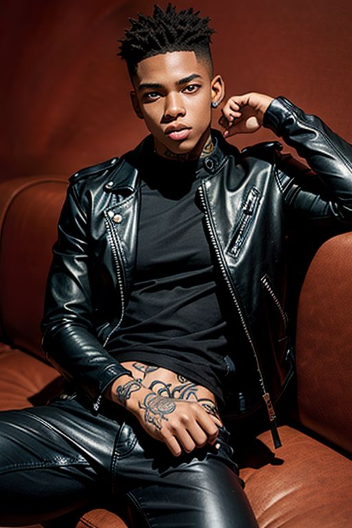 A 18 year old black man in his late twenties reclines with confidence against a deep red backdrop. His black attire and leather jacket and leather pants exude a bad-boy aura, complemented by his slicked-back hair and an array of tattoos.