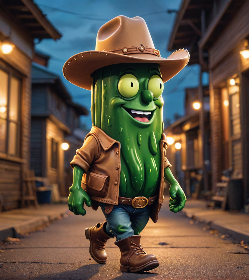 walking pickle with face, cowboy hat, art by Brandon Woelfel, art by Dan Mumford