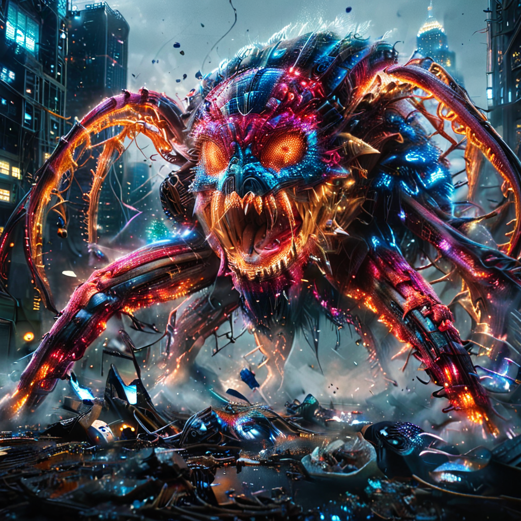 A gigantic, neon-glowing spider, its body easily spanning the length of several city blocks, descending upon a futuristic, cyberpunk metropolis. The creature's legs are adorned with countless LED lights, casting a kaleidoscope of colors across the ruined skyline below. In the distance, the once-glittering cityscape is now reduced to rubble and ash, with crumpled skyscrapers and shattered streets serving as the perfect playground for the colossal arachnid. The air is thick with the electricity of destruction, as the spider's razor-sharp fangs tear through buildings and vehicles alike with ease., <lora:add-detail-xl:1>, <lora:XL_boss_battle:1>, <lora:glowneon_xl_v1:1> <lora:ral-ledlights:1>, <lora:ral-vlntxplzn:0.8> ral-vlntxplzn