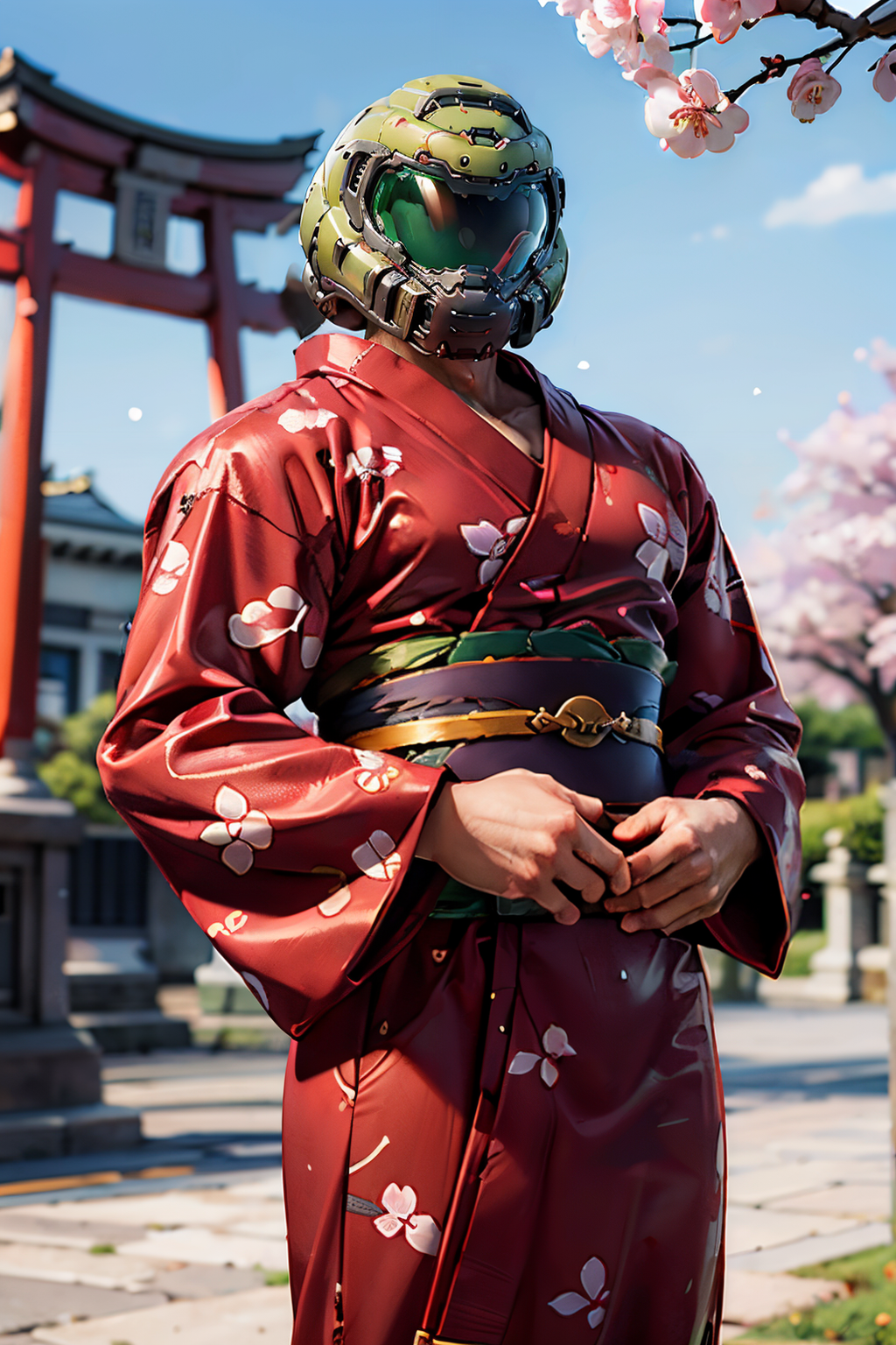 doom_slayer, muscular man, helmet, wearing traditional yukata, long sleeves, sash, looking at viewer, standing, outside, garden, red torii, cherry blossom, blue sky, high quality, masterpiece, <lora:Doom_Slayer:.7>