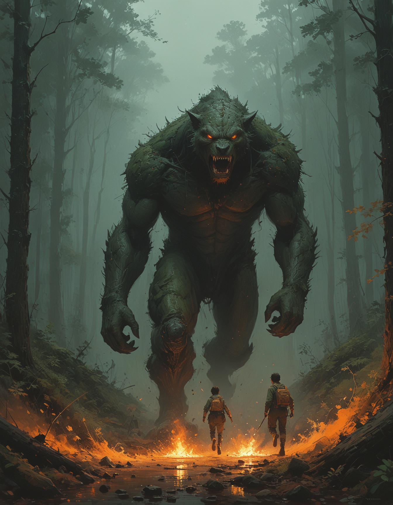 ([by Atey Ghailan|by Arne Jacobsen]:1.5), (Panting heavily, they flee in sheer terror from the rampaging beast, their frantic footsteps echoing through the relentless pursuit of the forest.:0.5)