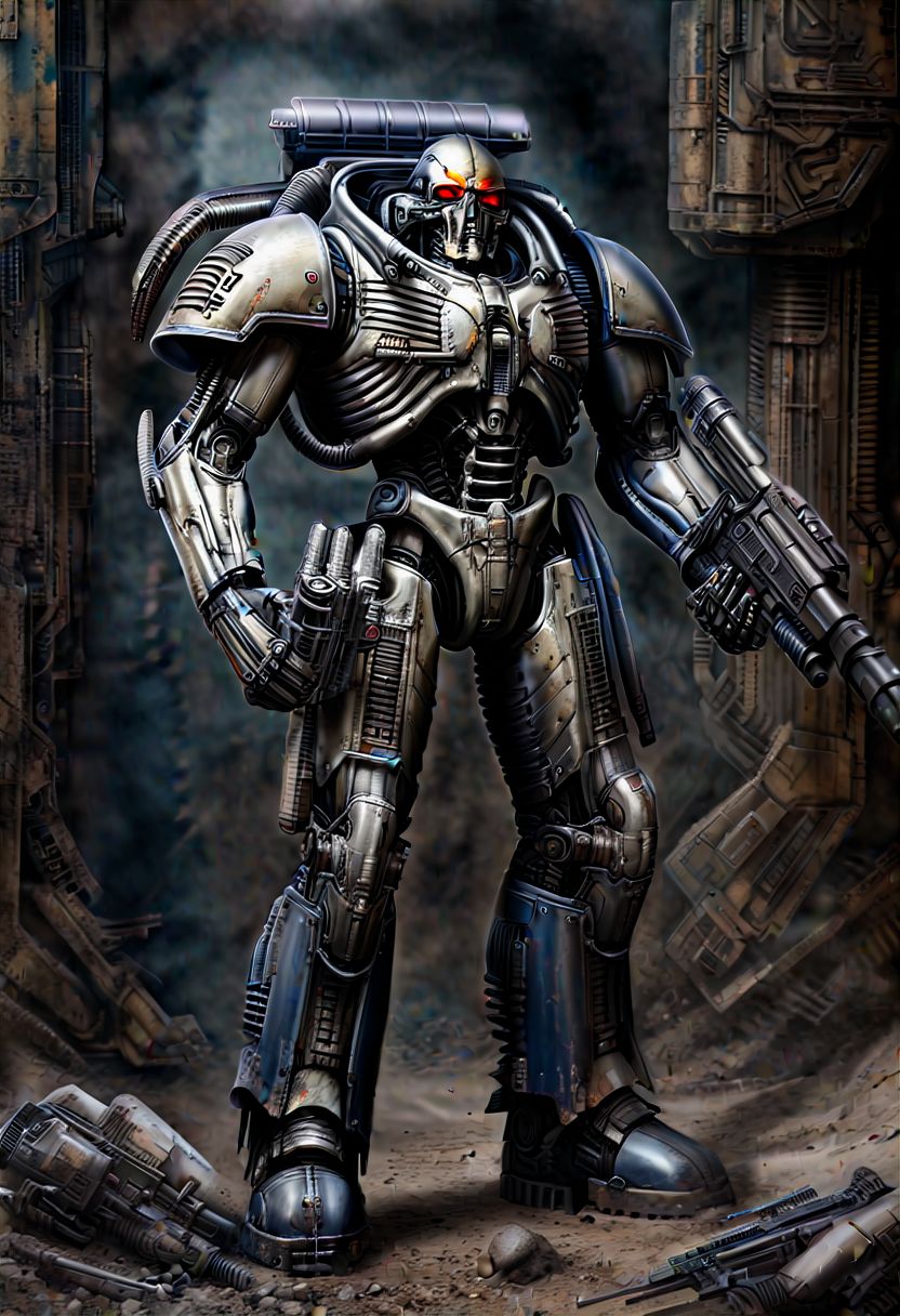Space marine oil stains mixed with(((terminator T-800 doom sleer))) caste.WITH THE INSCRIPTION ((USSR 1.4)) on the helmet, H. R. Giger style but depicted as an oil painting epic pose with a minigun.There is a space castle behind in full growth