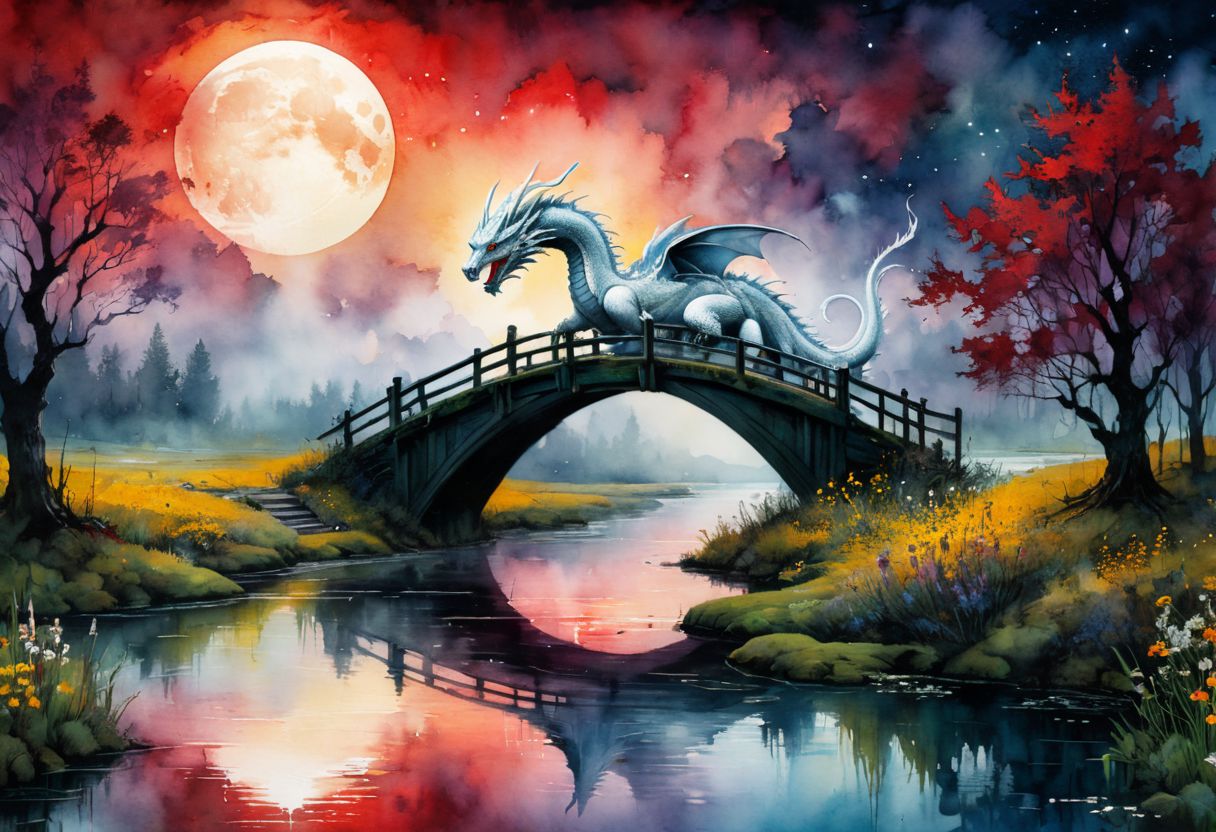 <(score_9,score_8_up,score_7_up,score_6_up,score_5_up,score_4_up):1.0>, <(Fantasy dreams, mesmerizing fantasy, magic, moon, fog, gloomy, ink, acrylic, double exposure, mythological, unforgettable, best quality, small bridge over the swampy river, Osama Fares, Van Gogh, Waterhouse, Craola, Carne Griffiths, Dan Mumford, Minjae Lee, Andy Kehoe, Miyazaki, patchwork, adorable, vintage, art on a cracked paper):1.2>, <(Storybook detailed illustration, cinematic, ultra highly detailed, tiny details, beautiful details, mystical, luminism, vibrant colors, complex background, Stylized watercolor art. A stunning white-dragon, dark eclipse, celestial dramatic event, small bridge over the swampy river, wildflowers):1.0>, <(by c215 and Arthur Rackham, Paul Barson, Paul Lovering, masterpiece, color print art, red sunrise, vibrant. Sharp, focused, vibrant, colorful, clear image, high contrast):0.9> <lora:add-detail-xl:1>, <lora:xl_more_art-full_v1:1.0>