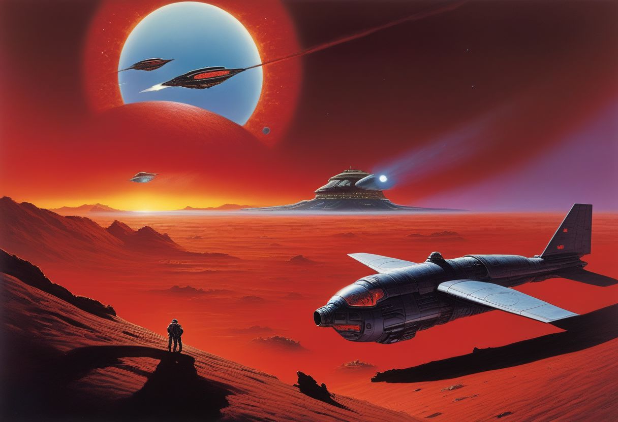 illustration for the cover of the of science fiction storie "Red Sun" from Clifford Simak, high resolution, high detail, bright lighting, digital painting