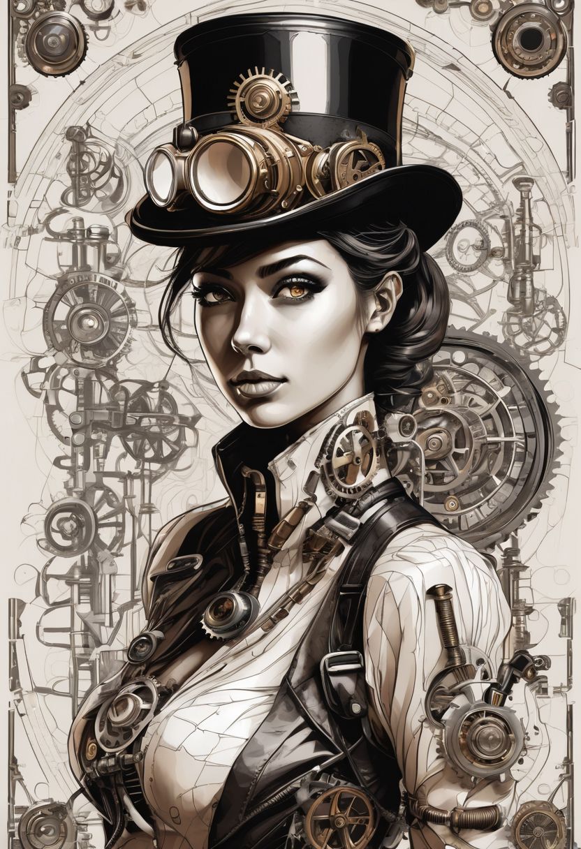 A captivating steampunk-inspired vector illustration of a woman dressed in a sophisticated manner, wearing a top hat and goggles. Her body is intricately detailed with cogs, gears, and pipes, reflecting the vintage sci-fi and retro-futuristic aesthetics. A minimalist white background accentuates her striking mechanical design, while her pose exudes a sense of adventure and intrigue. The image appeals to steampunk art aficionados and enthusiasts.