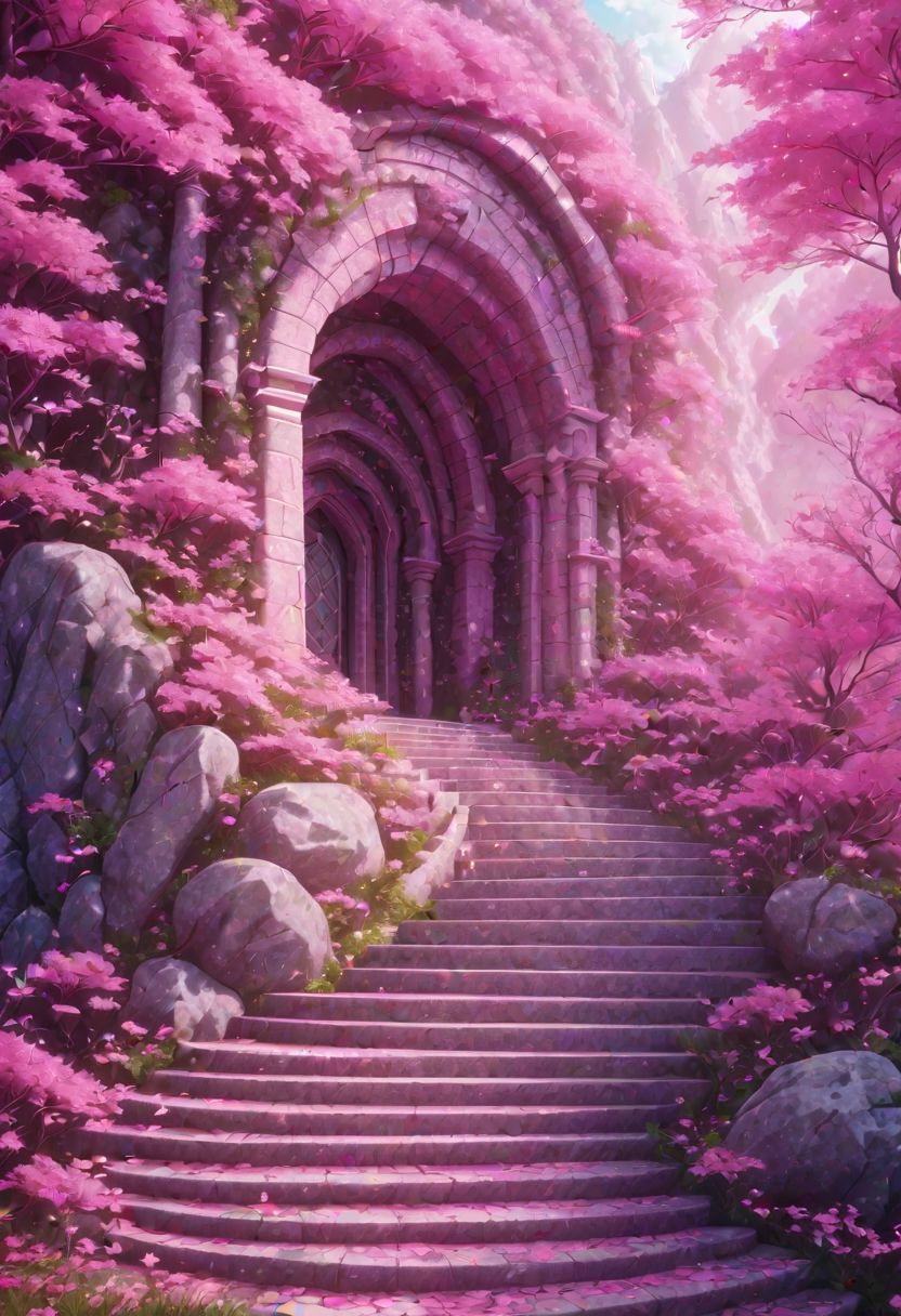 a staircase leading to a pink forest with flowers on it and a stone pathway leading to a stone staircase, fantasy, enchanting, detailed