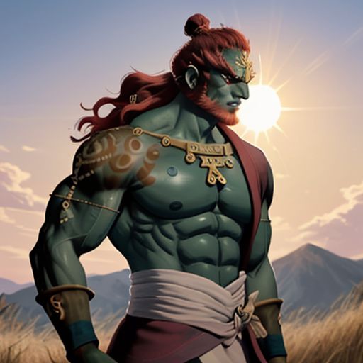 ganondorf, long wavy red hair, red beard, green skin, red eyes, muscular, lose clothing, shirtless, sweat drops, muscular sweat on body, blocking the sun from eyes, sun bathing, summer heat, summer weather