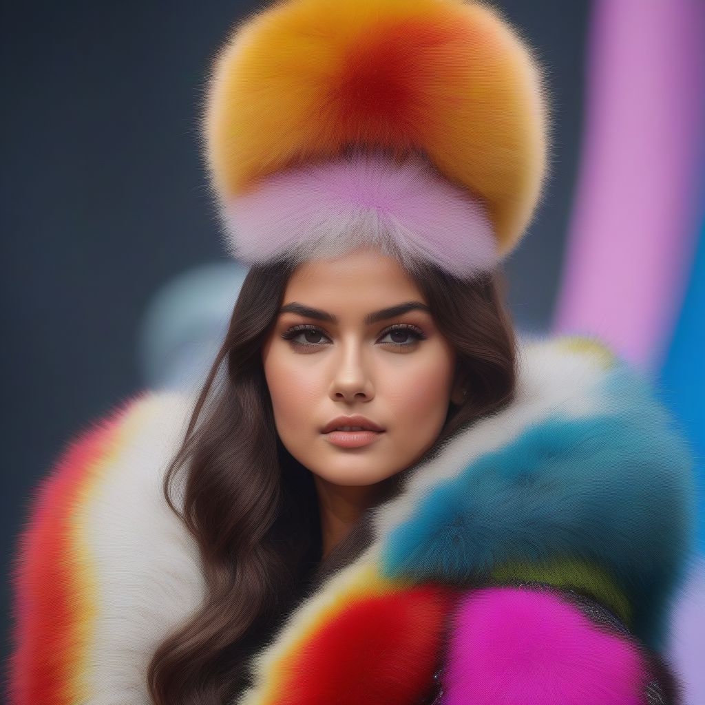 Portrait of (ohwx woman) <lora:SelenaGomez-000007:1> as a colorful fur queen wearing a fur coat made from a million furry pom-pom balls. She is also wearing an extremely thick, oversized & long fur scarf, as well as an extremely huge & over the top fur hat with tail sticking out the back of it. On her feet she is wearing knee high boots with fur trim cuffs on them. Her hair has been tied up in a massive huge bun with a fur scrunchie. She also has really thick, long & curly sideburns.