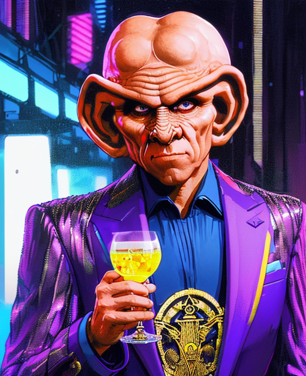 sdn <lora:diffusiondesign_SDN_LoRA_1.12:0.75>, (Complex Digital Artwork:1.3) of (Sketched:1.3) medium view of (Quark), ferengi, man, wearing opulent luxury suiting clothing, armin shimerman, holding out an intricate alien glass of alcohol,(by Artist Yoji Shinkawa:0.45),CGSociety,ArtStation,(Cyberpunk Art:1.3),(Vaporwave Art:0.8),(Retrofuturism:0.45),(Hypersaturated:1.3), city background, purple suit, closed mouth