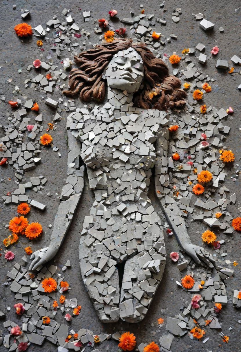 Shattered pieces of a Woman s body made of beton, broken, destroyed, lying on the floor, highly detailed, small tiny flowers