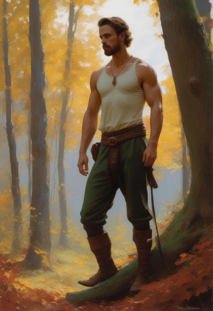 extremely detailed masterpiece by (Daniel F Gerhartz|Sam Guay|Guillaume Seignac]. romantic full body portrait. a 28-year-old Argentine hunter leans on a mahogany tree in autumn, patiently waiting for his lover. He wears a green tank top; pants; and a simple, plain necklace. He is masculine, (muscular:1.9], (extremely-hairy:2.2], dashing, rugged, and roguish, with bare massive biceps; a dark-brown very short undercut; an unshaved, perfect, stylish, short, neatly-trimmed beard; and dark-mahogany-toned skin. He expresses patience, hope, longing, and romance.