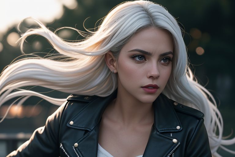 Dramatic Solar Eclipse Scene: a captivating scene during a solar eclipse, close up, ((Dynamic Pose)), a 37 year old woman, (((her long wispy platinum-white hair cascades from the breeze))), a private investigator, inspired by Law & Order, a sports pub at night, highlight resemblance to Ashley Benson and Elisabeth Rhm, emphasize her confident stance, black leather jacket, ripped jeans attire, undeniable charisma, her allure, beguiling essence, sensuality, full swollen lips, striking blue eyes, magnetic charm, enhanced ethereal ambiance, burgundy and white and orange complimentary colours, dramatic lighting, cinematic light-dust, stunning bokeh effects, infuse streak lens flares, orange accents, a cinematic touch, ultra-realistic visuals, creamy low contrast, shallow depth of field, ensuring detail shines, classic anamorphic style, 8K RAW format